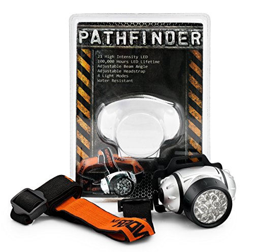 PATHFINDER 21 LED Headlamp Headlight – Lightweight, Comfortable and Weatherproof Flash Light/Torch – Water Resistant Safety Head Lamp - 4 User-Friendly Modes of Operation - Garage Workshop Garden Head lamp, Head Torch for Biking, Cycling, Climbing, Camping, Dog Walking, Hiking, Fishing, Night Reading, Riding, Running and other Outdoor and Indoor Activities - Adjustable Head Strap - 135 Degrees Adjustable Beam Angle - 100,000 Hours LED lifetime (in RETAIL PACKAGING) - SILVER